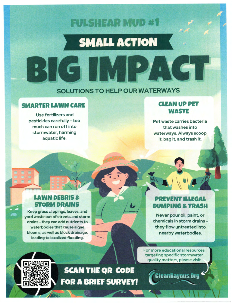 If you have any questions about the erosion control project, please contact Fulshear MUD 1’s engineer, Pape-Dawson Engineers, at 713-428-2400.